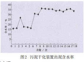 由圖 2 可見,污泥干化裝置出泥含水率平均29.0%,達到了設計目標 40% 以下的預期,滿足生產需要。