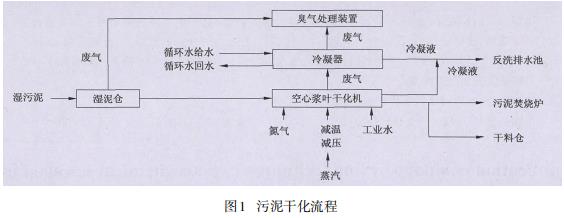 污泥干化裝置主要由儲存及進料系統、干化機、出料系統、蒸汽減溫減壓系統、噴淋除塵等系統組成。工藝流程見圖1。