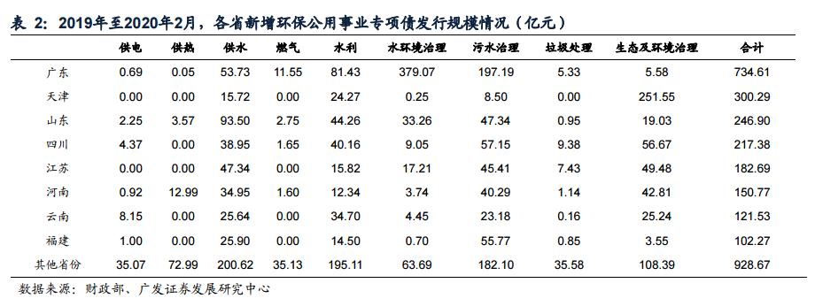 從地域角度來看,2019年1月至2020年2月,廣東、天津、山東、四川四省新增專項債占全國比例達50%,四省中除天津外,廣東、山東、四川投資于水務(wù)項目比例分別為95%/88%/67%。